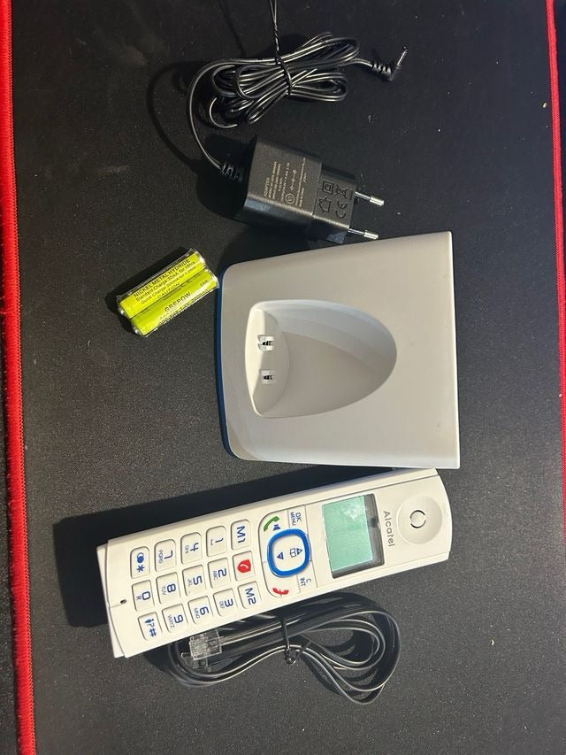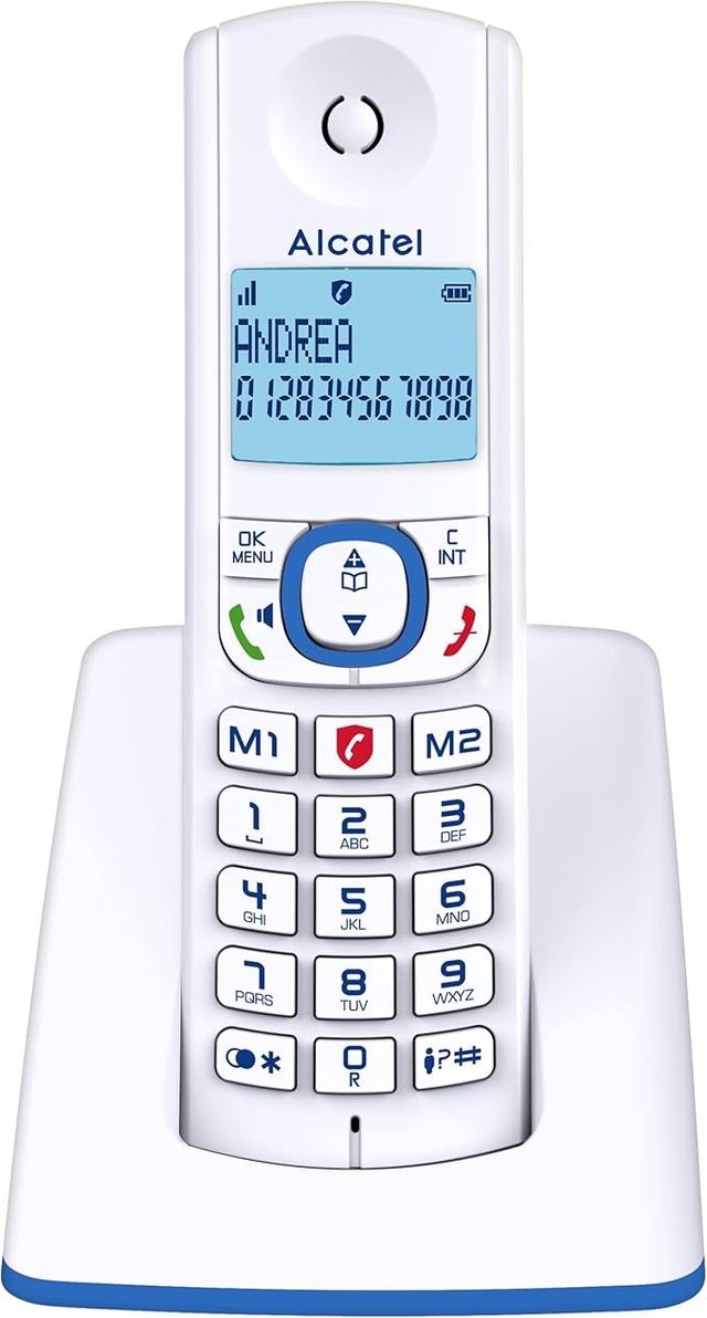 Alcatel F530 - Teléfono inalámbrico con bloqueo avanzado de llamadas, manos libres, gran pantalla retroiluminada, tonos de llamada VIP, 10 melodías de llamadas, blanco/azul, versión FR