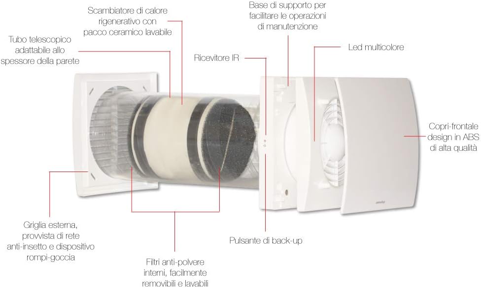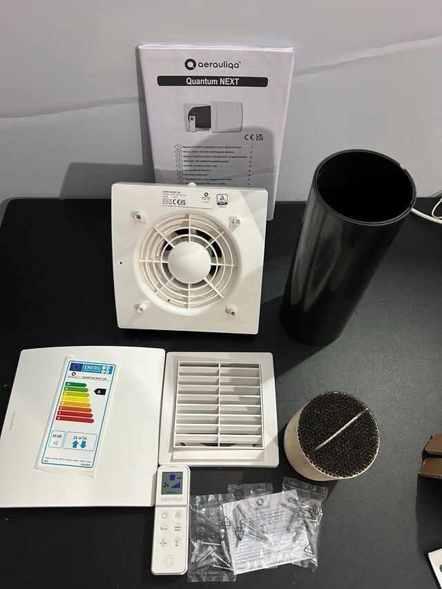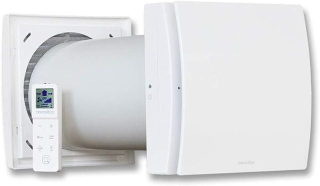 Quantum Next 100 de Aerauliqa - Unidad de VMC descentralizada de flujo alternado con recuperación de calor, súper silenciosa, con mando a distancia multifunción, diám. 108 - Cód.004388, blanco RAL